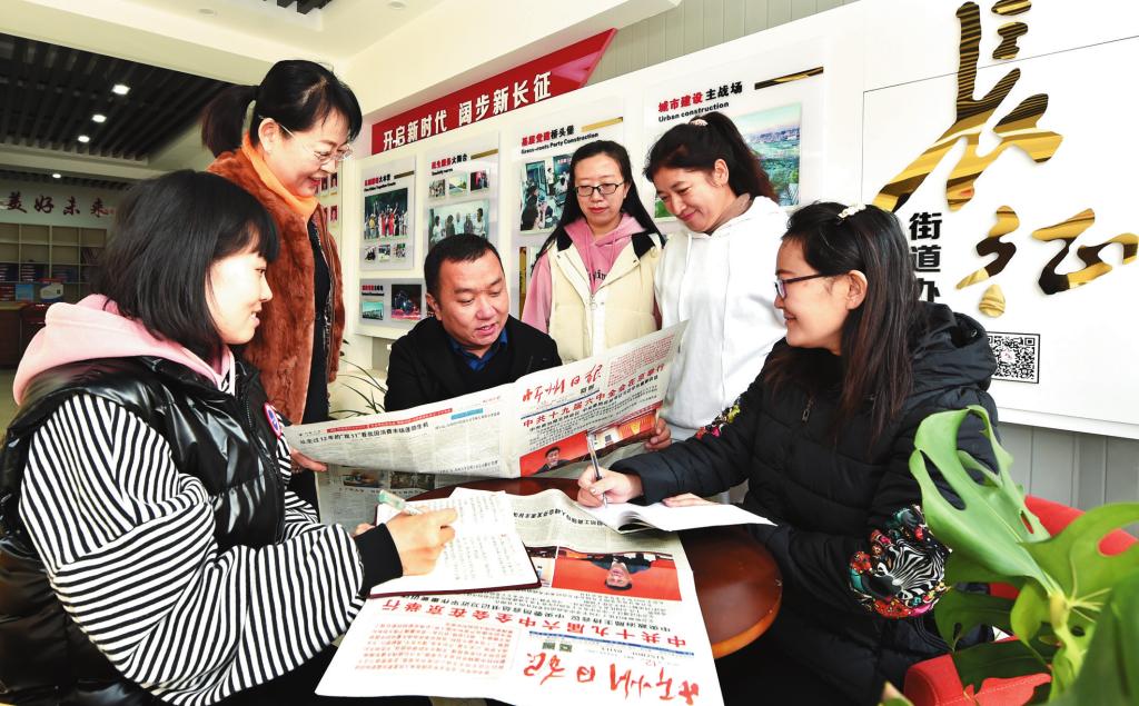 忻府區(qū)長征街街道辦事處和平東街社區(qū)工作人員認(rèn)真學(xué)習(xí)十九屆六中全會精神。馮曉磊 攝