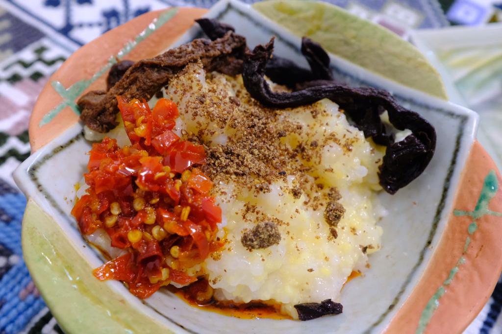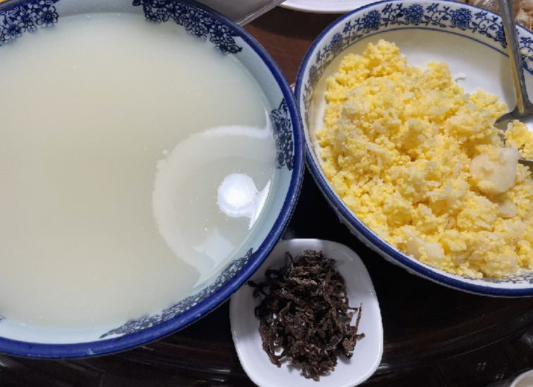 (酸粥配上偏關(guān)人自制的紅腌菜、麻面子,甚是美味。攝影趙婧)