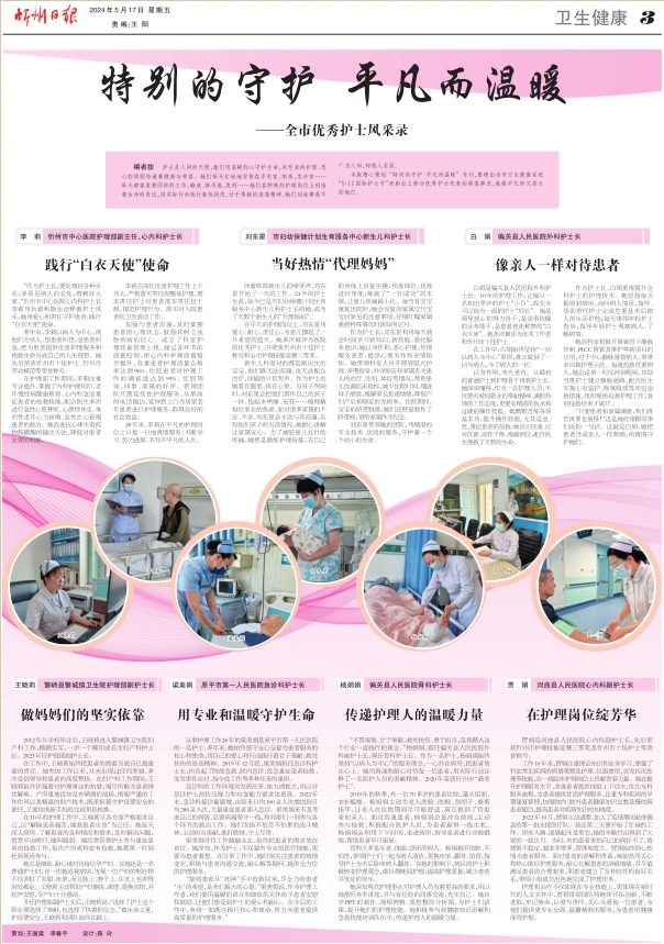 本版精心策劃 “特別的守護(hù) 平凡而溫暖” ??沓鋈行l(wèi)生健康系統(tǒng)“5·12國(guó)際護(hù)士節(jié)”表彰會(huì)上部分優(yōu)秀護(hù)士代表的典型事跡,致敬平凡而又偉大的她們。