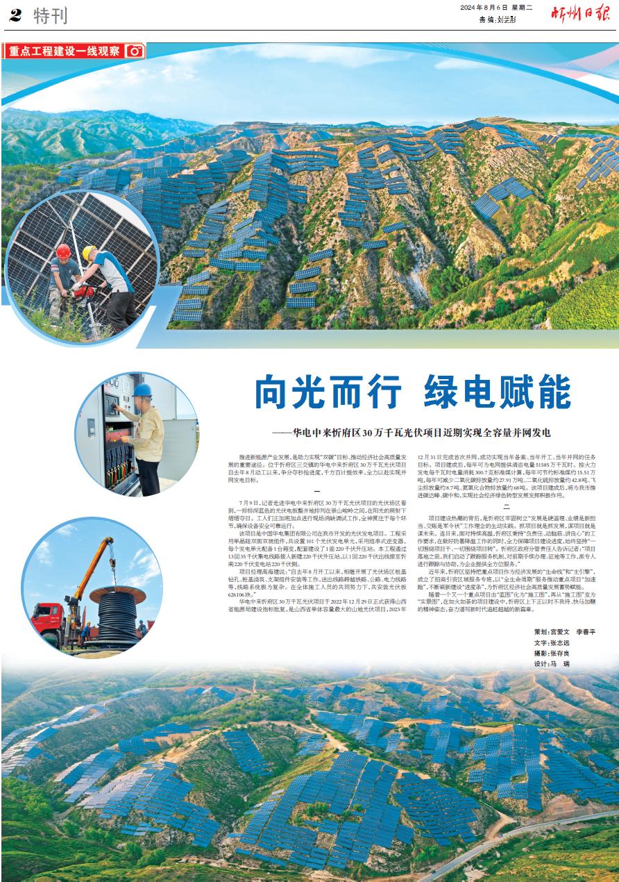 華電中來忻府區(qū)30萬千瓦光伏項目于2022年12月29日正式獲得山西省能源局建設(shè)指標(biāo)批復(fù),是山西省單體容量最大的山地光伏項目,2023年12月31日完成首次并網(wǎng),成功實現(xiàn)當(dāng)年備案、當(dāng)年開工、當(dāng)年并網(wǎng)的任務(wù)目標(biāo)。項目建成后,每年可為電網(wǎng)提供清潔電量51585萬千瓦時。按火力發(fā)電每千瓦時電量消耗300.7克標(biāo)準(zhǔn)煤計算,每年可節(jié)約標(biāo)準(zhǔn)煤約15.51萬噸,每年可減少二氧化碳排放量約27.91萬噸、二氧化硫排放量約42.8噸、飛塵排放量約8.7噸、氮氧化合物排放量約68噸。該項目建成后,將為我市推進(jìn)碳達(dá)峰、碳中和,實現(xiàn)社會經(jīng)濟(jì)綠色轉(zhuǎn)型發(fā)展發(fā)揮積極作用。