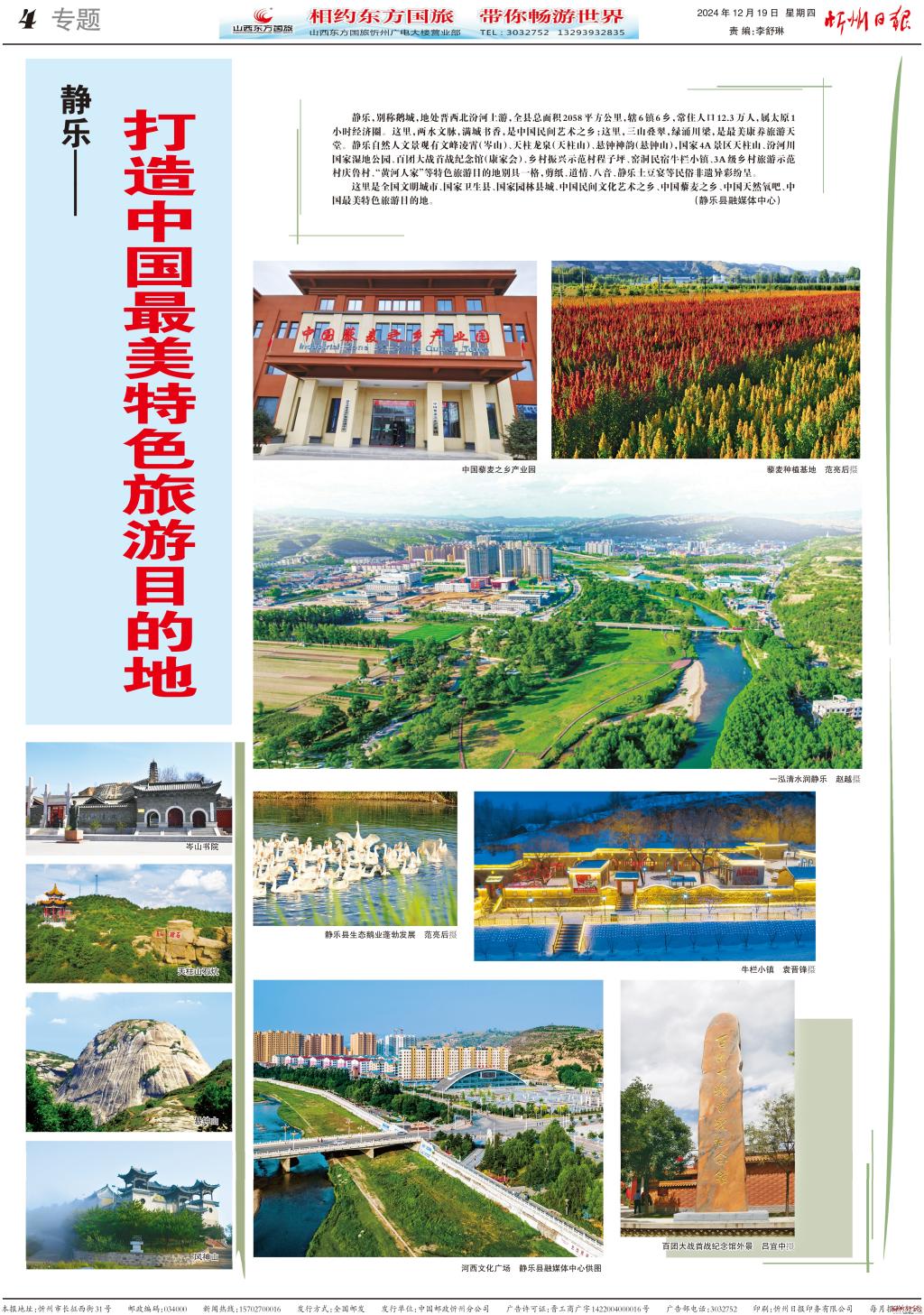 靜樂,別稱鵝城,地處晉西北汾河上游,全縣總面積2058平方公里,轄6鎮(zhèn)6鄉(xiāng),常住人口12.3萬人,屬太原1小時經(jīng)濟圈。這里,兩水文脈,滿城書香,是中國民間藝術(shù)之鄉(xiāng);這里,三山疊翠,綠涌川梁,是最美康養(yǎng)旅游天堂。靜樂自然人文景觀有文峰凌霄(岑山)、天柱龍泉(天柱山)、懸鐘神韻(懸鐘山),國家4A景區(qū)天柱山、汾河川國家濕地公園、百團大戰(zhàn)首戰(zhàn)紀(jì)念館(康家會)、鄉(xiāng)村振興示范村程子坪、窯洞民宿牛欄小鎮(zhèn)、3A級鄉(xiāng)村旅游示范村慶魯村、“黃河人家”等特色旅游目的地別具一格,剪紙、道情、八音、靜樂土豆宴等民俗非遺異彩紛呈。