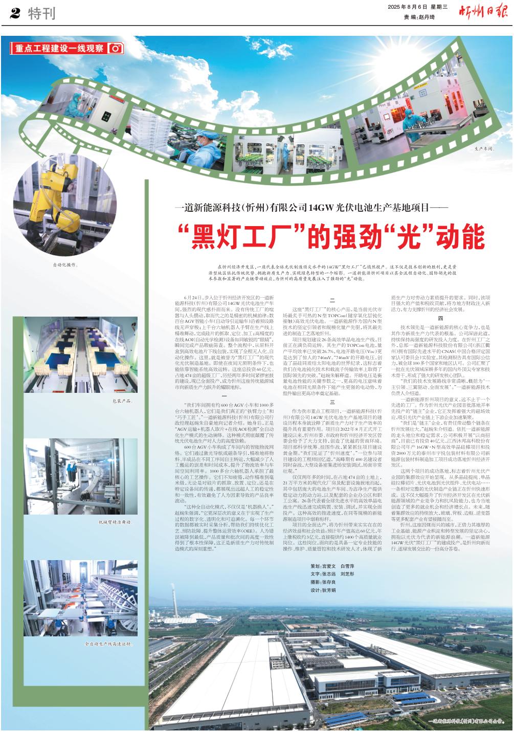 6月24日,步入位于忻州經濟開發(fā)區(qū)的一道新能源科技(忻州)有限公司14GW光伏電池生產車間,強烈的現代感撲面而來。沒有傳統(tǒng)工廠的喧囂與人頭攢動,取而代之的是精密的機械韻律:數百臺AGV智能小車(自動導引運輸車)沿著預設路線無聲穿梭;上千臺六軸機器人手臂在生產線上精準舞動,完成硅片的抓取、定位、加工;高精度的在線AOI(自動光學檢測)設備如同敏銳的“眼睛”,瞬間完成產品瑕疵篩查。整個流程中,從原料開盒到高效電池片下線包裝,實現了全程無人化、自動化操作。這里,就是被譽為“黑燈工廠”的現代化光伏制造基地。即使在夜間無照明條件下,也能依靠智能系統(tǒng)高效運轉。這座總投資60億元、占地474畝的超級工廠,歷經兩年多時間緊鑼密鼓的建設,現已全面投產,成為忻州這座傳統(tǒng)能源城市向新質生產力躍升的耀眼地標。