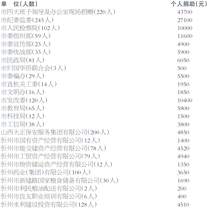 2023年11月10日,市委、市政府辦公室發(fā)出《關(guān)于開展“送溫暖、獻愛心”社會捐助活動的通知》,市四大班子領(lǐng)導(dǎo)和機關(guān)率先垂范,各縣(市、區(qū))、各單位高度重視,認真組織,廣大干部職工積極響應(yīng),“送溫暖、獻愛心”社會捐助活動有效開展。截至2024年4月底,市直133個單位組織干部職工參與捐助,共捐款83.37萬元,各縣(市、區(qū))接收捐款365.92萬元,合計捐款449.29萬元,為解決我市困難群眾的基本生活問題起到了積極作用?,F(xiàn)將捐助情況公告如下(市直單位以捐助時間先后為序):