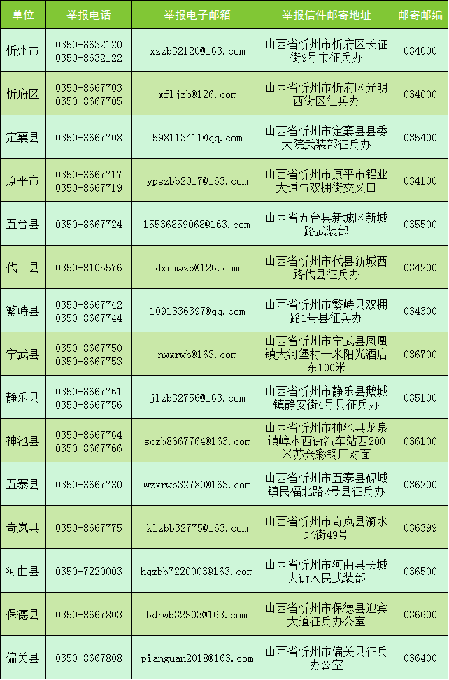 為認(rèn)真貫徹落實(shí)上級(jí)關(guān)于廉潔征兵的政策規(guī)定,維護(hù)廣大應(yīng)征青年的合法權(quán)益,嚴(yán)明征兵紀(jì)律,拓寬監(jiān)督渠道,營造風(fēng)清氣正的征兵環(huán)境,現(xiàn)將2025年忻州市級(jí)廉潔征兵監(jiān)督員和市縣兩級(jí)舉報(bào)電話、郵箱等信息予以公示,歡迎全社會(huì)對(duì)征兵工作進(jìn)行監(jiān)督。