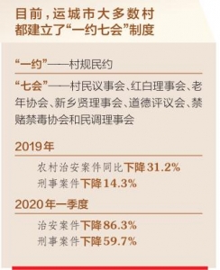 目前,運城市大多數(shù)村都建立了“一約七會”制度——“一約”是村規(guī)民約,“七會”是村民議事會、紅白理事會、老年協(xié)會、新鄉(xiāng)賢理事會、道德評議會、禁賭禁毒協(xié)會和民調理事會。這“一約七會”制度的不斷健全,對破除鄉(xiāng)村社會陋習、引導群眾移風易俗、引領社會新風、化解矛盾糾紛,維護基層社會和諧穩(wěn)定起到了重要作用。村民的正能量多了,鄉(xiāng)村的負面事情少了,社會治安狀況得到明顯改善,群眾安全感顯著增強。2019年運城市農村治安案件同比下降31.2%,刑事案件下降14.3%;2020年一季度,治安案件下降86.3%,刑事案件下降59.7%。