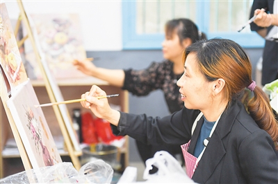 近年來,湖南省瀏陽市小河鄉(xiāng)引進農(nóng)民畫室產(chǎn)業(yè),讓農(nóng)民可以在家務(wù)農(nóng)時利用空余時間務(wù)工。小河鄉(xiāng)現(xiàn)有460余名農(nóng)民畫師,累計帶動50余名貧困戶參與。圖為小河鄉(xiāng)烏石村村民在繪制油畫。