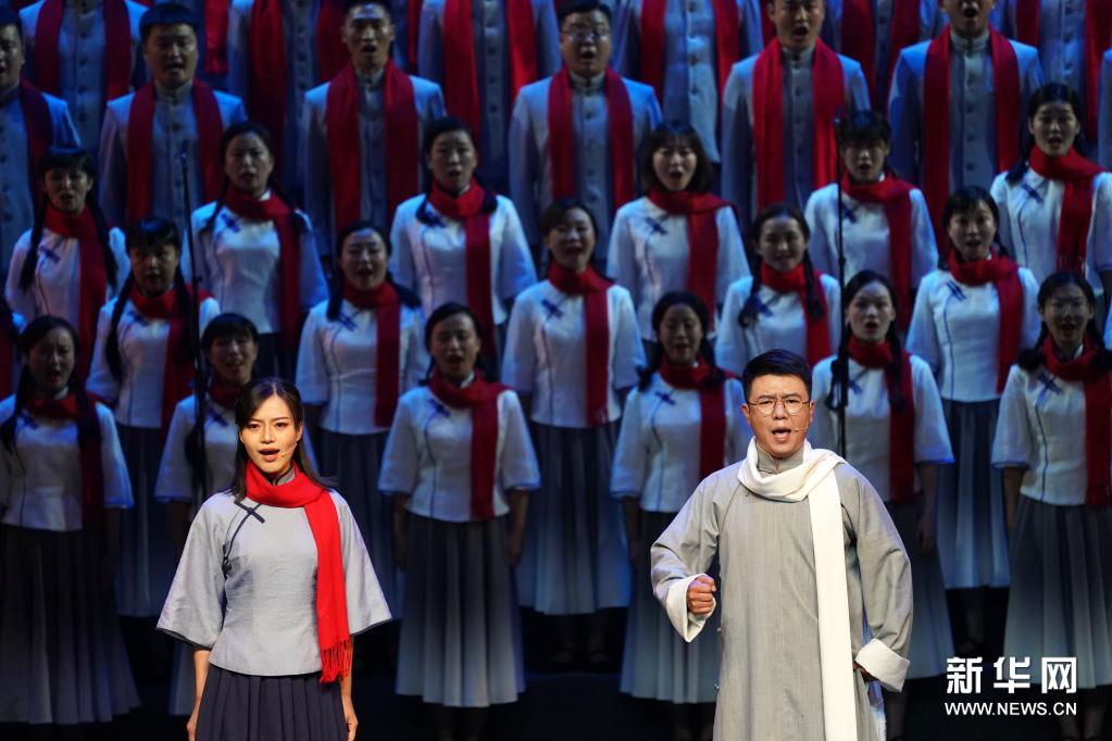 6月30日,在山西大劇院,演員在合唱《國際歌》。當(dāng)日,山西省慶祝中國共產(chǎn)黨成立100周年文藝匯演在山西省太原市山西大劇院舉行。新華社記者 詹彥 攝