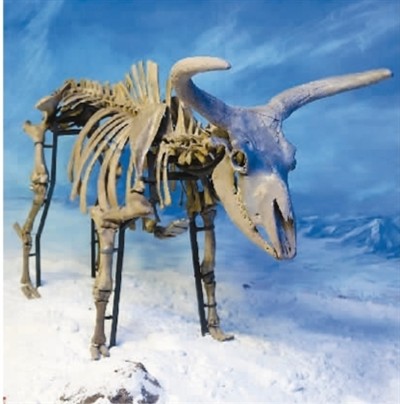 眼前這具披毛犀骨架化石,1990年出土于吉林松原,是我國最完整的披毛犀骨架化石之一。披毛犀頭上本來長有2只角,但由于是角質(zhì)的角,不是骨質(zhì)的,不能保存下來成為化石。在它的旁邊,是一具吉林乾安出土的原始牛骨架化石。原始牛生存于距今40萬年-1萬年的晚更新世。吉林省自然博物館收藏的這具原始牛化石,是亞洲保存最完整的原始牛骨架化石,堪稱“鎮(zhèn)館之寶”。