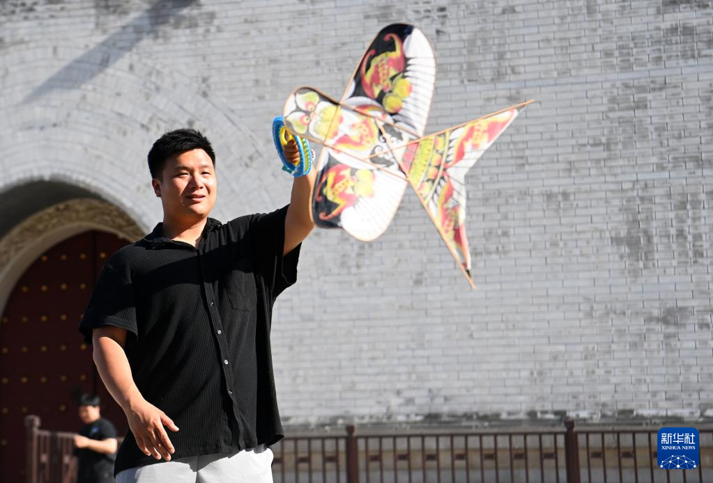 在天津市鼓樓附近,魏博文在放飛一架制作完成的風(fēng)箏(6月8日攝)。