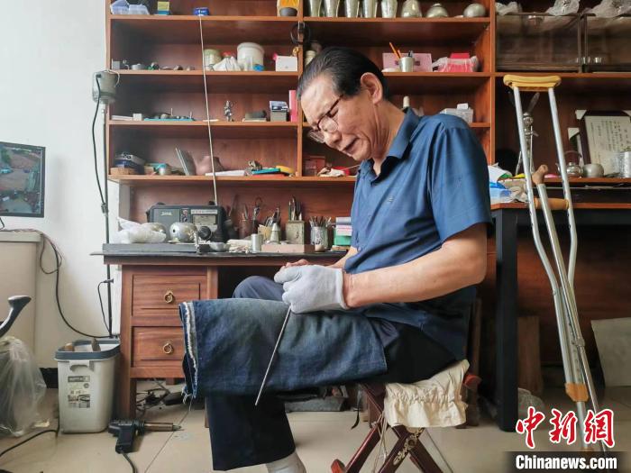 王圣良告訴記者,小時(shí)候他因?yàn)樯。饶_落下了殘疾,別的兄弟姐妹出去玩,他就跟著爺爺學(xué)習(xí)錫雕。“做錫雕需要心靜、身靜,因?yàn)樾凶卟环奖?,我比其他人更坐得住,在學(xué)習(xí)錫雕上更有‘優(yōu)勢(shì)’”。