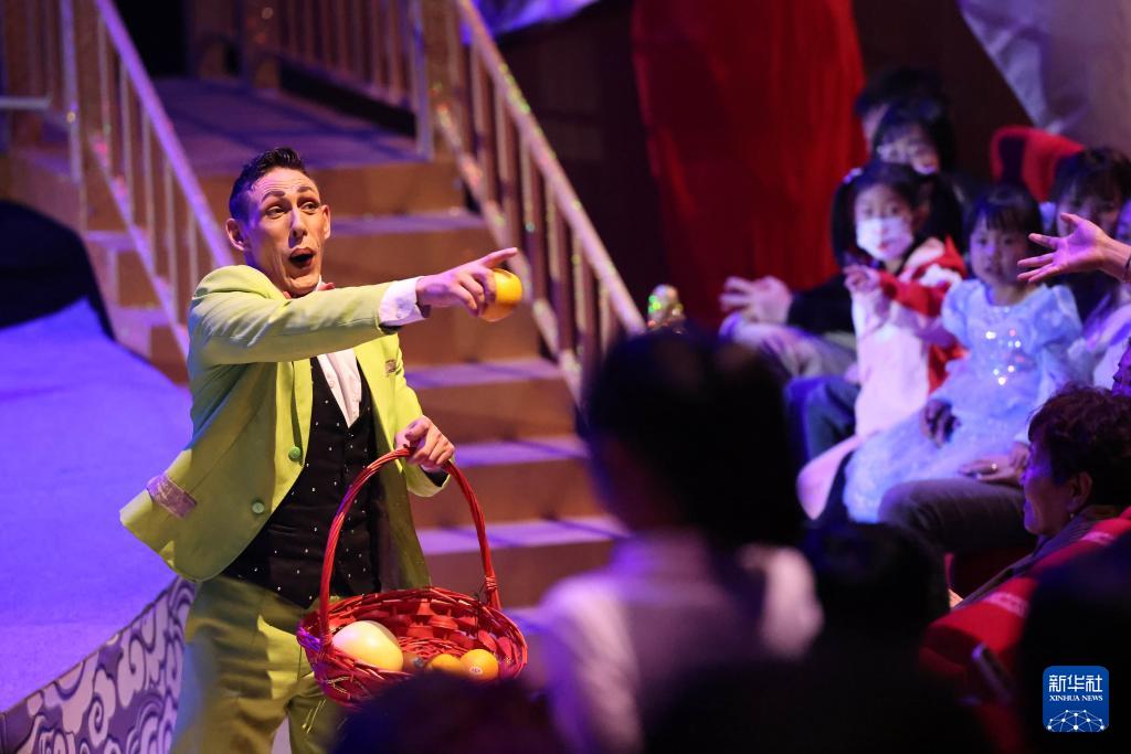 10月28日,演員在河北省滄州市吳橋縣吳橋雜技大世界景區(qū)江湖大劇院與觀(guān)眾互動(dòng)。