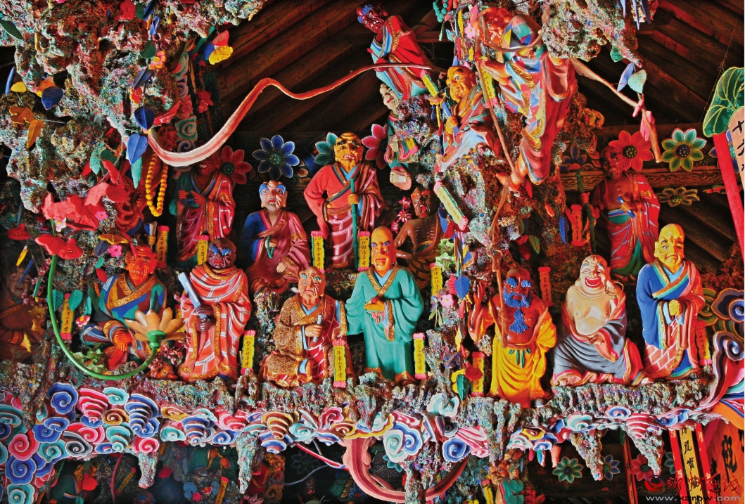 金閣寺現(xiàn)存的寺廟建筑及塑像,均在明、清、民國復(fù)修。寺廟坐北向南,占地面積2.l萬平方米,呈正方形。穿牌坊,登臺階,進天王殿,殿檐下掛著題有“金閣寺”的大匾。在第一處大院中間,矗立一座大閣,內(nèi)供高17.7米的千手(實為48臂)觀音銅像,這是五臺山最高最大的圣像。像原本為銅鑄,造于明嘉靖四年(1525年),后人重修該寺時,為使觀音更加中性化,便在銅像外面貼泥、金妝,從肩膀兩旁伸出許多胳膊,手執(zhí)各種兵器,加成了48臂,顯得異常威武,號千手觀音。殿閣內(nèi),左右后柱兩個1米高的石柱礎(chǔ),為圓形中間束腰上下卷蓮瓣形,是唐代遺物。