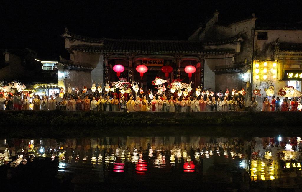 9月15日,花燈表演隊(duì)伍在安徽省黃山市黟縣宏村巡游(無(wú)人機(jī)照片)。新華社發(fā)(施亞磊 攝)