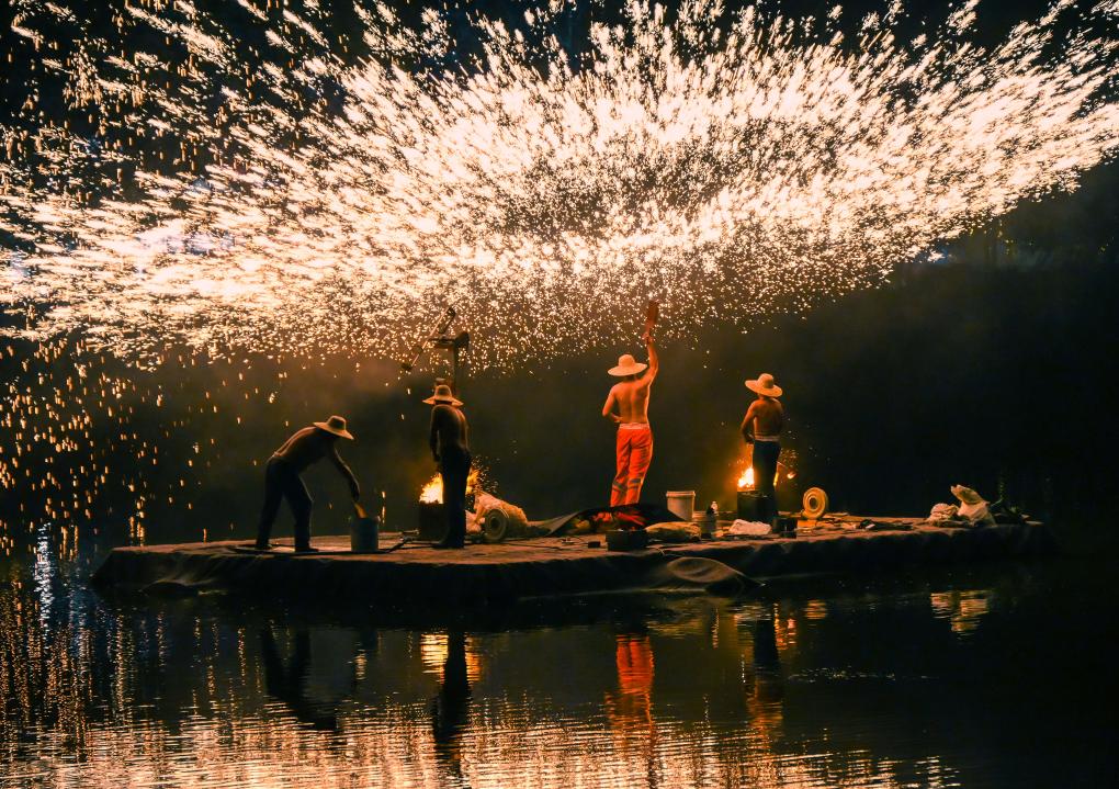 這是9月16日在安徽省宿州市碭山縣梨小萌歡樂(lè)梨園景區(qū)拍攝的打鐵花表演。新華社發(fā)(崔猛 攝)