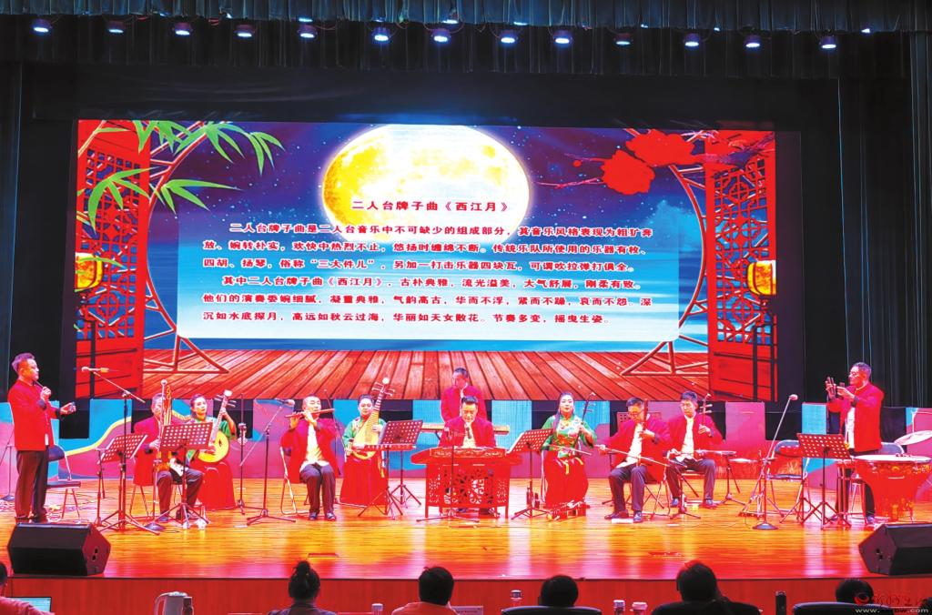 由河曲縣文化和旅游局選送、河曲縣民歌二人臺藝術團演奏的二人臺牌子曲《巴音杭蓋》,是一首標題性器樂曲。從曲式上看,屬“多基腔板式變化體”,由“慢板”“流水板”“捏字板”3種板式構成;從音調上看,滲入了內蒙古民間器樂元素,并使用了“清角為宮”的手法,使其在總的徵調式基礎上具有了多宮調、多調式因素而形成動力性和展開性。演奏中,全體演奏員配合默契,充分運用即興加花、支聲復調的傳統(tǒng)演奏手法,“團玩”而熱鬧。