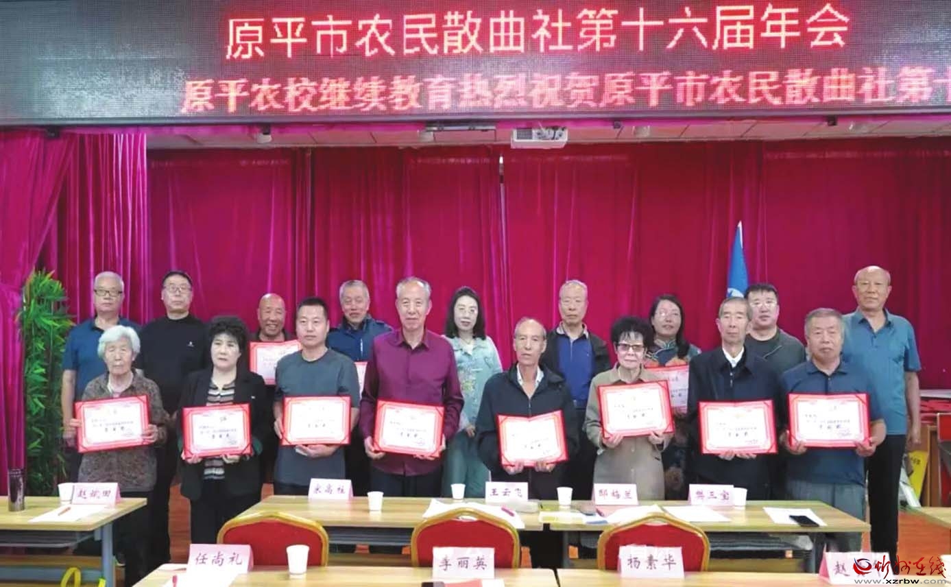 散曲社朗誦部的曲友們在悠揚(yáng)音樂聲中,激情澎湃地朗誦著五谷飄香的農(nóng)民散曲,20多名優(yōu)秀社員受到表彰,展示出原平農(nóng)民散曲的喜慶豐收景象。“詩如潮,農(nóng)民種曲名聲在,情如火,南腔北調(diào)心澎湃。曲如海,同舟共濟(jì)承傳愛,暖如春,一年四季花不敗?;ㄩ_滿地鮮,曲韻熔天籟,好一個震驚曲界田園派。”這首散曲《正宮·塞鴻秋》道出了散曲社社員們的心聲。