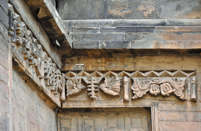 ▲原平白石村蘭氏民居大門的磚雕拱券,周飾連珠紋、山字紋和纏枝瑞草紋圖案,建于清代。