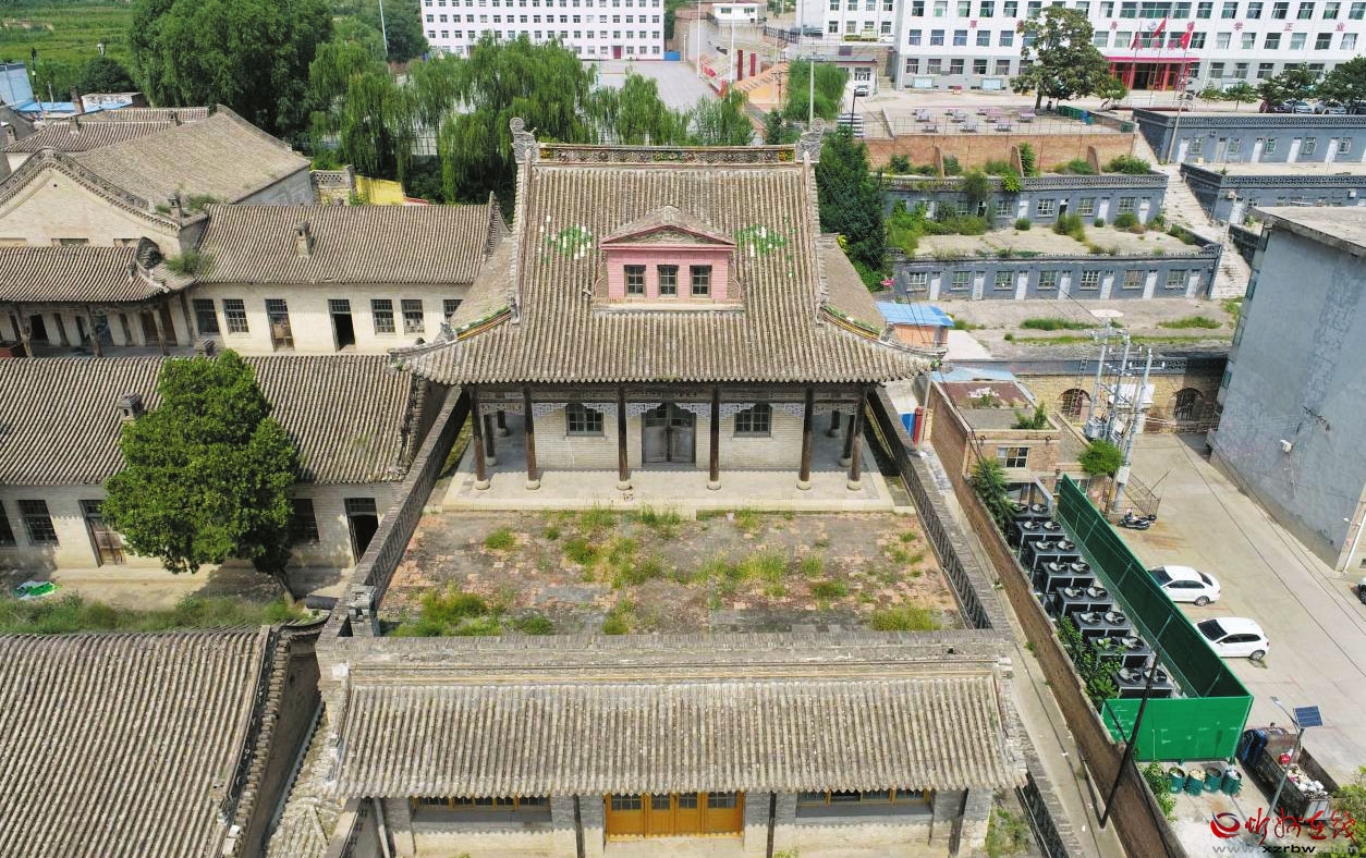 第四層平臺上,正對中軸線門洞的是大禮堂。大禮堂坐北朝南,長45米、寬24米。禮堂前設卷棚歇山抱廈3間,石雕柱礎石,木雕圈口暗八仙,柱間雀替鏤空雕刻花卉、飛禽等圖案。斗拱三踩,柱頭科耍頭萬字形,平身科耍頭龍形。禮堂內置天花板,主席臺前木雕欄桿,上部設垂蓮柱;禮堂外左右各有5間教室,邊上為回長廊。禮堂后建石券窯洞9間,為教師宿舍,窯洞頂建木結構房間15間,為教學辦公區(qū);禮堂西側是寬闊的操場。