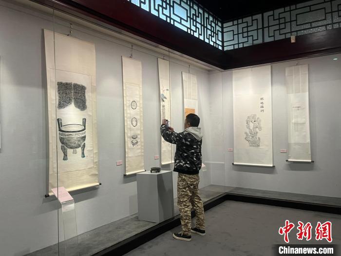 12月24日,湖北省級非遺項目“金石器物全形傳拓技藝”代表性傳承人張友海(右)帶領(lǐng)友人參觀武漢博物館“墨拓千秋——金石器物全形傳拓技藝保護成果展”。中新社記者 武一力 攝