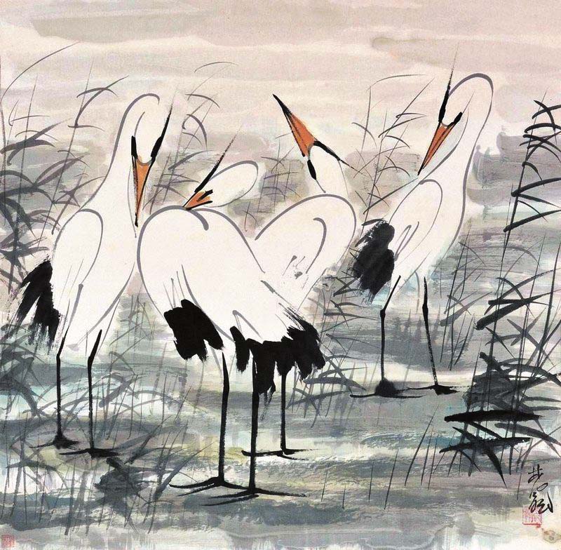 到了近現(xiàn)代,傳統(tǒng)文藝思想開(kāi)始發(fā)生轉(zhuǎn)變,呂澂、康有為等人在繪畫(huà)領(lǐng)域提出改良思想,鶴主題的繪畫(huà)也有所變化。在林風(fēng)眠創(chuàng)作的《群鶴圖》《雙鶴圖》《白鶴》等作品中,既可以看到中國(guó)畫(huà)白描的影子,又可以感受到西方速寫(xiě)技法的影響?!度胡Q圖》由幾只立于廣袤水草的白鶴構(gòu)成,它們姿態(tài)各不相同。與鶴之閑適姿態(tài)相對(duì)應(yīng)的是隨風(fēng)浮動(dòng)的蘆葦,它們?cè)谖L(fēng)吹拂下雖形態(tài)萬(wàn)千,但并不雜亂,在總體偏暗的色調(diào)中顯出和諧之味?!峨p鶴圖》表現(xiàn)了鶴的輕盈姿態(tài),兩只鶴步伐保持一致,展示出閑適自得之感。林風(fēng)眠筆下的鶴,顯然沒(méi)有古代繪畫(huà)中仙風(fēng)道骨、富貴長(zhǎng)壽之意,與寫(xiě)意之鶴相比,其作品里的鶴與自然萬(wàn)物融為一體,表達(dá)出強(qiáng)有力的現(xiàn)代語(yǔ)言。