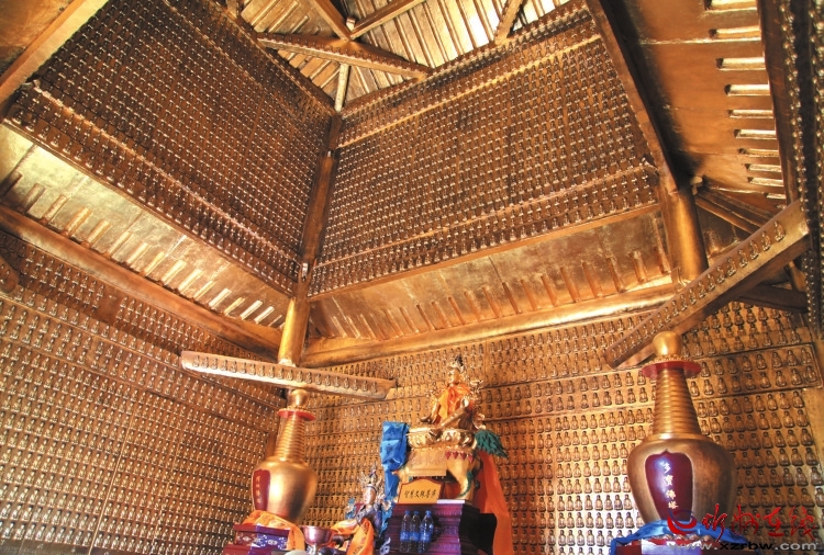 隔扇外壁鑄有36幅花卉圖案,有二龍戲珠、魚躍龍門、犀牛望月、玉兔拜月等,構(gòu)圖清晰,形象生動(dòng)。殿內(nèi)四壁滿鑄小佛,號稱萬佛,佛像形態(tài)各異,栩栩如生。殿內(nèi)正中供奉著一尊高達(dá)1米的銅鑄文殊騎獅像,其鑄藝高超,神態(tài)逼真,體態(tài)閑適,是明代銅鑄佛像之珍品。