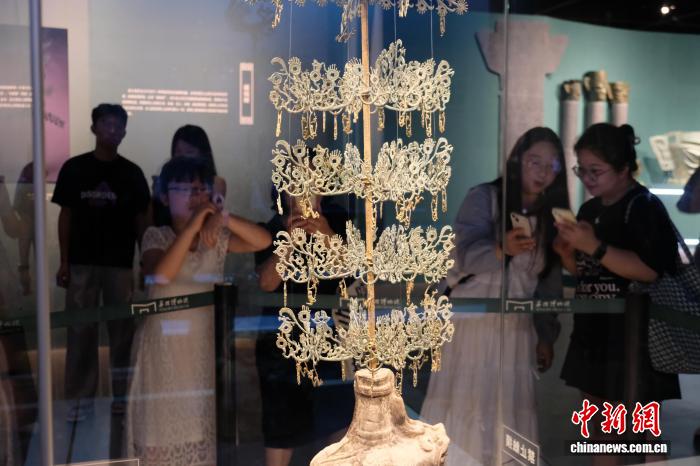 8月2日,游客在浙江寧波觀看三臺(tái)縣博物館藏“馬猴搖錢(qián)樹(shù)樹(shù)身”。 林波 攝