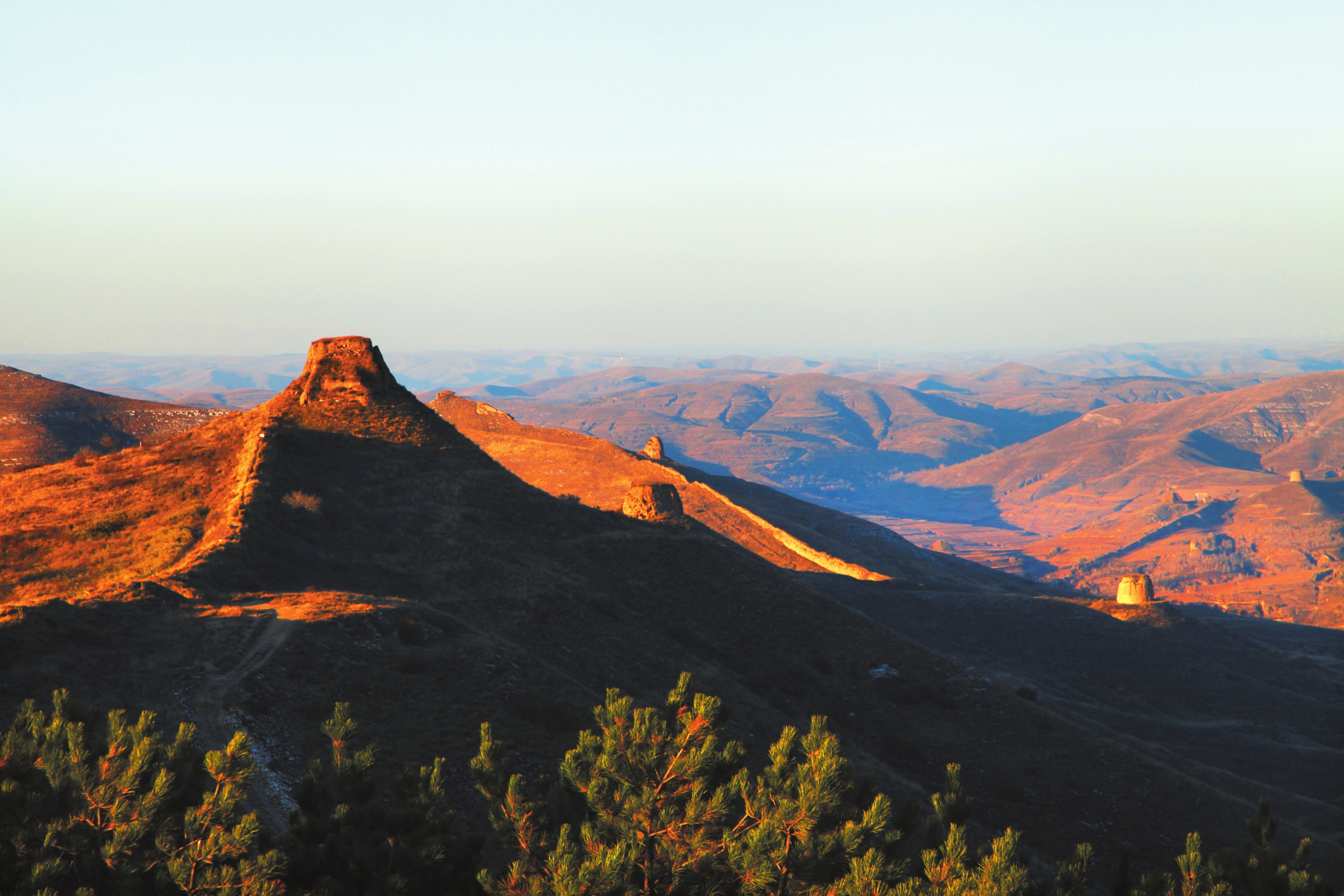 秋日,筆者一行乘車向偏關城東北百里處的柏楊嶺進發(fā),在到達小營堡時,開始向公路北部的山間小道行駛,一路上沿著長城一線一直向北,大約行25里,快要上到山頂?shù)臅r候,一派壯麗的北國風光映入眼簾:這里重巒疊嶂,一片片茂密的青綠色油松郁郁蔥蔥。起伏的山巔上一座座莊嚴聳立的烽火墩臺漸次林立,又如一顆顆閃亮的明珠鑲嵌于崇山峻嶺之間。當年隨著明王朝的建立,為了加強京師的防御能力,開始在北方修筑了內外兩道長城防線,而地處偏關的柏楊嶺,正是兩道長城相匯的地方,也被形象地稱為“山西結”。
