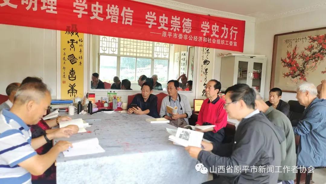 近日,原平市老年新聞文化學(xué)會(huì)組織開展了一次以學(xué)黨史悟思想為主旨的專題筆會(huì)活動(dòng)。學(xué)會(huì)會(huì)長楊愛英、學(xué)會(huì)黨支部書記劉興良跟學(xué)會(huì)書畫藝術(shù)組成員一起,在這秋高氣爽、陽光燦爛的日子里,以滿腔熱情來到學(xué)會(huì)辦公中心柳巷牡丹園,參加了這一集研討和書法于一體的別開生面的活動(dòng)。學(xué)會(huì)文化合作單位增壽口腔、金色童年、萬源石雕與奶爸奶媽等單位人員,以及部分書畫愛好者共近50人,共同分享了書藝交流的喜悅。