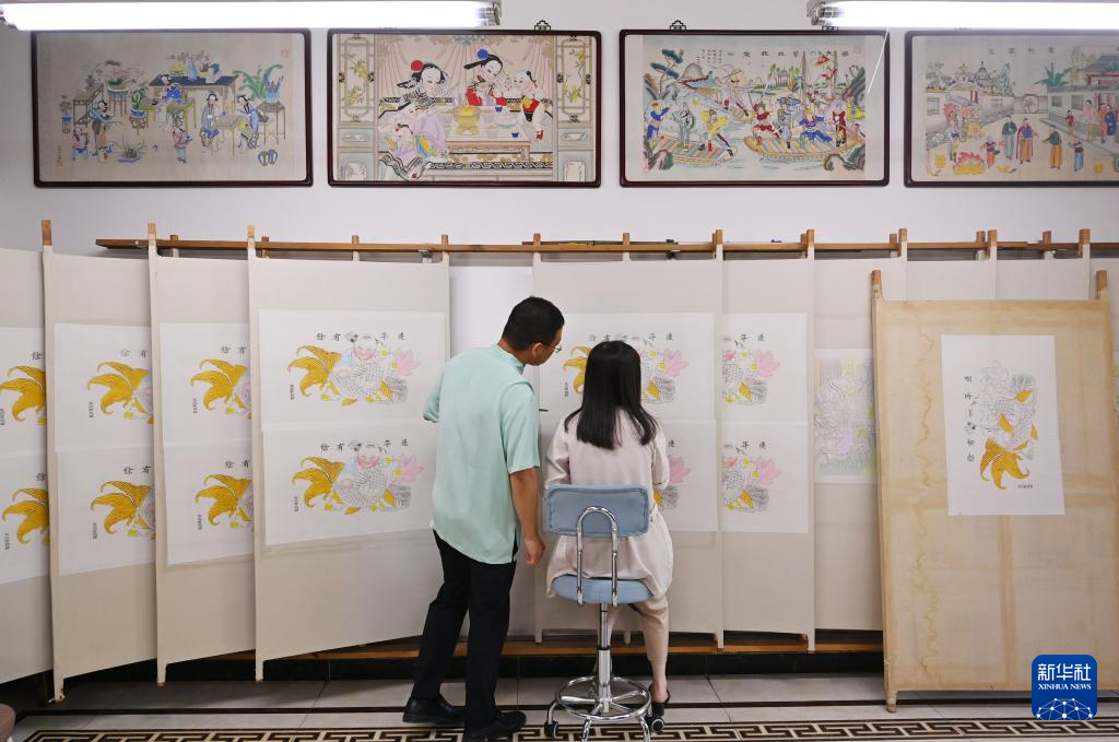多年來(lái),為了更好地保護(hù)傳承楊柳青木版年畫,霍樹林和父親將散落在各地的古版、畫稿搜集起來(lái),籌建起一座年畫博物館,不同時(shí)期、風(fēng)格各異的年畫古版有上百塊?;魳淞终f(shuō):“得讓年畫從墻上‘走下來(lái)’,吸引更多年輕人的目光?!比缃?,他和同為傳承人的妻子王丹一起將年畫元素與現(xiàn)代文創(chuàng)相結(jié)合,設(shè)計(jì)出的團(tuán)扇、宮燈、撲克等產(chǎn)品,深受年輕消費(fèi)者喜愛(ài)。新華社記者 李然 攝