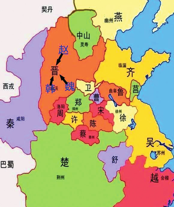 晉文公執(zhí)政繼承其父三軍六卿制,韓、趙、魏、范、智、中行六卿各有自己的領地,勢力日漸擴張,他們一方面維護晉國霸業(yè),另一方面蠶食晉國君權和國土。到晉定公時期,晉國權勢趨向衰弱,六卿之間也相互蠶食領地。晉出公時期,智氏組織韓、趙、魏討伐范氏和中行氏,迫使二氏出逃,后韓、趙、魏、智四家瓜分了范氏和中行氏所有封地。四氏中,智氏領土最多,勢力最強,故向韓、趙、魏索要所得封地,韓、魏懼而滿足智氏要求,趙斷然拒之,被迫出逃,智氏組織韓、魏擊之未成。事后,韓、魏共識前車之鑒,唇亡齒寒,于是韓、趙、魏三卿聯(lián)合擊智,盡滅智氏全族。