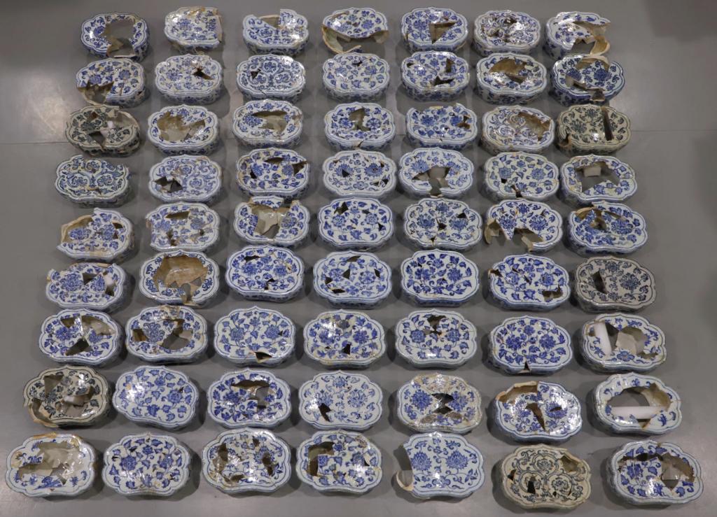 完成初步拼對的部分瓷枕修復(fù)件。(景德鎮(zhèn)御窯博物院供圖)