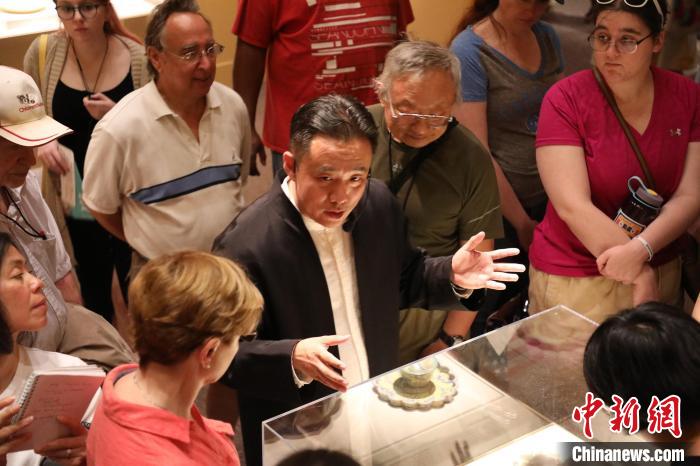 2019年6月,柏群在美國(guó)華盛頓的一家博物館向觀眾介紹金漆鑲嵌技藝。 (受訪者供圖)