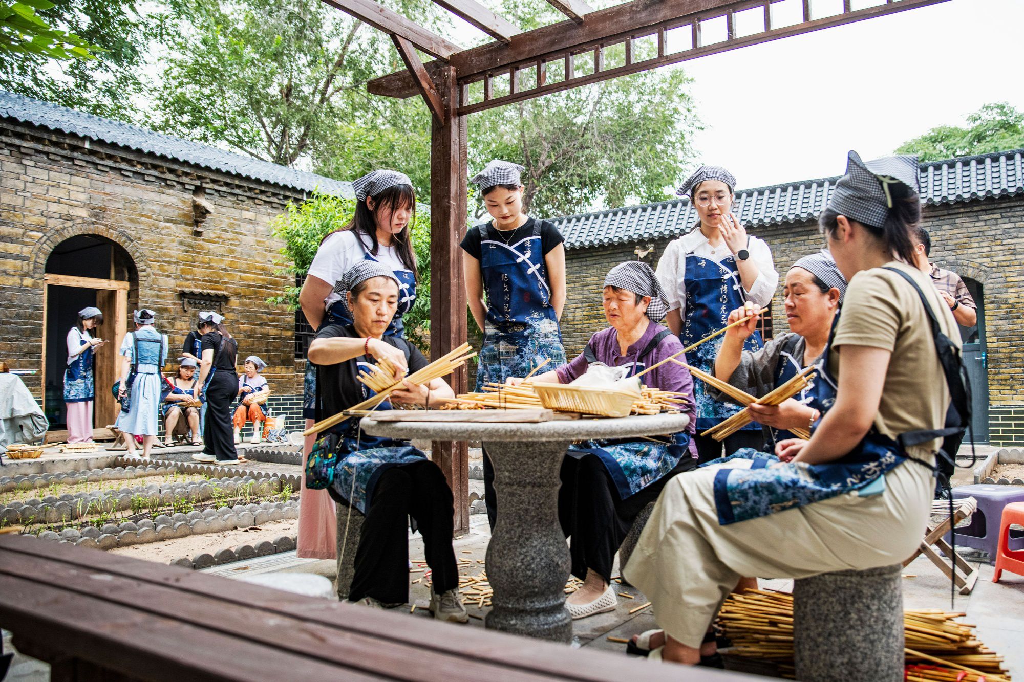 近日,在河北省高陽縣斗洼村“保定小院”內(nèi),民間老藝人教一群學(xué)生學(xué)做箅簾、兜嘍箅,傳承民間技藝,體驗傳統(tǒng)文化,賦予“保定小院”文化氣息。