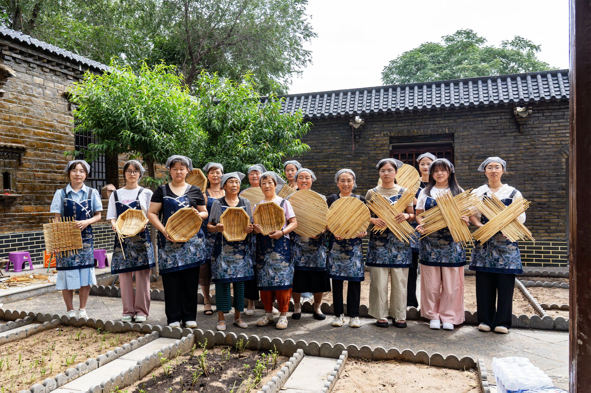現(xiàn)場,青磚灰瓦老式房屋建筑,充滿年代感。幾位年近70歲的老藝人在院中圍坐,制作起箅簾來動作嫻熟,眼隨手走,針線在高粱稈間上下穿梭,擠緊、壓實、細縫、剪圓,每道工序十分嚴謹。學(xué)生們有模有樣地學(xué)做,不時向老人請教交流,現(xiàn)場氣氛活躍、趣味十足。一個多小時,一個個手工制作的箅簾、兜嘍箅基本成型,看著自己的勞動成果,大家臉上洋溢著喜悅的笑容。