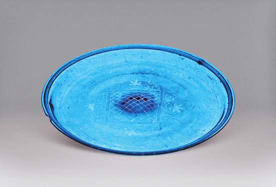 據(jù)地宮出土的物賬碑記載,整個(gè)地宮被布置得“窮天上之莊嚴(yán),極人間之煥麗”。在這些文物中,有六件來自阿拉伯國(guó)家的刻紋藍(lán)玻璃盤。玻璃盤保存完好,為無模吹制成形,通體藍(lán)色,晶瑩光潔,盤面刻滿紋飾,主體紋飾為以雙線勾勒出的十字形框架,盤心為正方形方框,方框外刻四個(gè)拱門形狀的尖瓣,與中心方框組成四個(gè)“米哈拉布”紋樣?!懊坠肌笔且了固m教清真寺大殿的禮拜龕,四個(gè)尖瓣內(nèi)各刻一朵五瓣葉子植物紋,尖瓣之間也飾以植物紋。制作工藝是在玻璃成器之后,用比玻璃更堅(jiān)硬的工具在其表面淺刻花紋,加以描金,從而使得玻璃盤更為華麗。