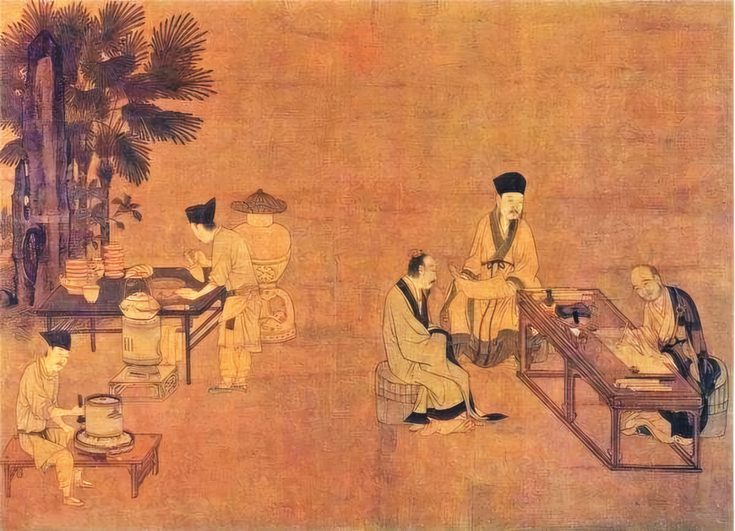 藝術(shù)為抹茶文化增添了無窮魅力。從南宋劉松年的《盧仝烹茶圖》,到宋人以茶汁為墨的“茶畫”,茶已然超越味蕾,升華為藝術(shù)。畫家以濃淡不同的茶汁在宣紙上揮毫潑墨,利用茶汁中的單寧酸,創(chuàng)造出變化莫測的色彩效果。