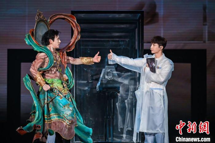 《受到召喚·敦煌》運用了“AI+3D+即時影像+真人動畫融合”技術(shù),以高色階大屏,打破了傳統(tǒng)的觀演模式和舞臺空間,巧妙地融合了歷史與未來、東方與西方文化元素,構(gòu)建起沉浸式觀演空間。舞臺上,當(dāng)數(shù)字修復(fù)的莫高窟壁畫徐徐展開時,21世紀(jì)30年代的敦煌數(shù)字研究中心實習(xí)生張燃與20世紀(jì)30年代的“敦煌守護神”常書鴻,跨越一個世紀(jì),展開時空對話,給現(xiàn)場觀眾留下了深刻印象。