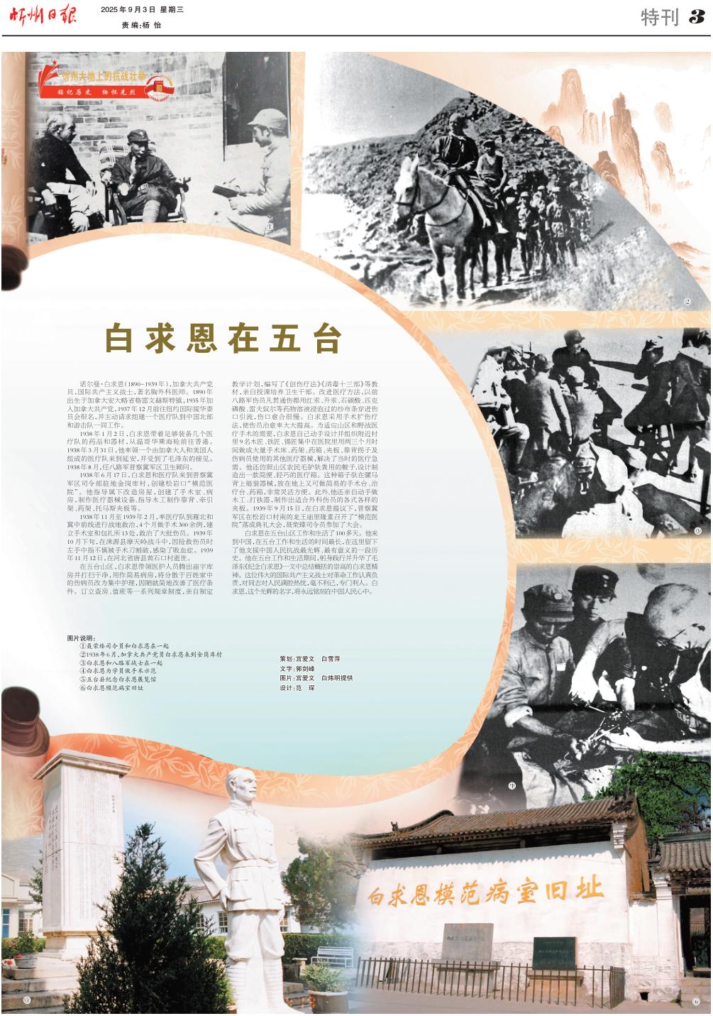 白求恩在五臺山區(qū)工作和生活了100多天。他來到中國,在五臺工作和生活的時(shí)間最長,在這里留下了他支援中國人民抗戰(zhàn)最光輝、最有意義的一段歷史。他在五臺工作和生活期間,躬身踐行并升華了毛澤東《紀(jì)念白求恩》一文中總結(jié)概括的崇高的白求恩精神。這位偉大的國際共產(chǎn)主義戰(zhàn)士對革命工作認(rèn)真負(fù)責(zé),對同志對人民滿腔熱忱,毫不利己,專門利人。白求恩,這個(gè)光輝的名字,將永遠(yuǎn)銘刻在中國人民心中。