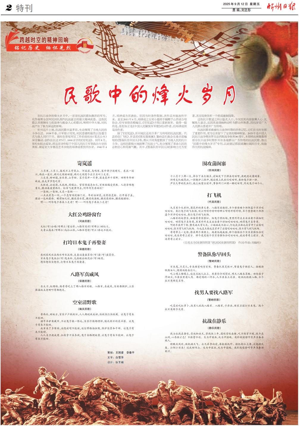 抗戰(zhàn)民歌承載著抗日戰(zhàn)爭時期的珍貴記憶,它們在當(dāng)時發(fā)揮了重要作用,更為后世留下了寶貴的精神財(cái)富。2025年是中國人民抗日戰(zhàn)爭暨世界反法西斯戰(zhàn)爭勝利80周年,本報特此搜集整理部分抗日戰(zhàn)爭時期忻州市各地群眾廣為傳唱的抗戰(zhàn)民歌,推出“民歌中的烽火歲月”???,以此銘記那段波瀾壯闊的歷史,致敬偉大的抗戰(zhàn)精神。