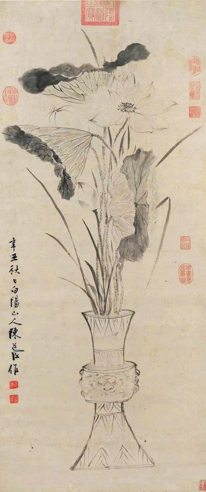 陳淳的《瓶荷寫生圖》中,一青銅花觚內(nèi)插數(shù)枝荷花,細(xì)葉菖蒲點(diǎn)綴其間。向上伸展的枝葉幾乎占滿畫面,盡顯夏日花草的勁挺之氣與蓬勃生機(jī)。此作給人最大的視覺感受是不拘一格的瀟灑筆觸與靈動(dòng)造型,尤其靠下方的兩片荷葉,以及右側(cè)彎折垂下的一片細(xì)葉,甚至顯現(xiàn)出一絲不加修飾的潦草、頹敗之感,而恰是對(duì)此等細(xì)節(jié)的保留,生動(dòng)體現(xiàn)出植物自然的生長(zhǎng)姿態(tài)。