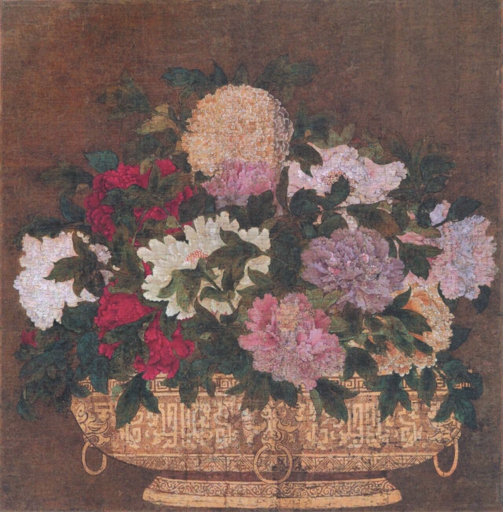 日本知恩院藏有一幅宋代《牡丹圖》,畫上共12朵盛放的牡丹,尺寸超大,花色各異。盛花器皿是一只類似簋的金色青銅器,器形圓滿端莊,紋飾線條飽滿,連拉環(huán)都被畫成滿圓,材質(zhì)似為青銅,也可能是金。花朵插放與花器呈“品”字偏圓形布局。細(xì)密的絹絲雖已襤褸,但其靜穆而雍容華貴的氣質(zhì)仍令人震撼——它是傳世牡丹圖中最令人印象深刻的一幅。