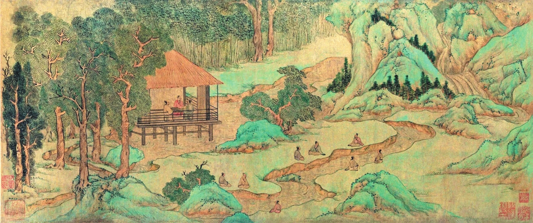 自宋代起,商賈或官宦常邀請好友、文人、畫師于亭中雅聚,作飲酒、和詩、品茗、撫琴的風(fēng)雅活動?!锻ひ分惺珍浟税儆嗥び洠渲芯陀型豸酥短m亭集序》、歐陽修《醉翁亭記》《豐樂亭記》、蘇軾《放鶴亭記》等。刺史歐陽修與民同樂:“俯仰左右,顧而樂之。于是疏泉鑿石,辟地以為亭,而與滁人往游其間?!蓖こ蔀樗磉_(dá)人生追求、人格志向的物象,而亭記描述的內(nèi)容也已遠(yuǎn)超建筑物本身。亭子的存在不僅是為觀景、停歇、雅集,文人的喜好與情感,也讓亭子逐漸成為一種顯著的文化符號。