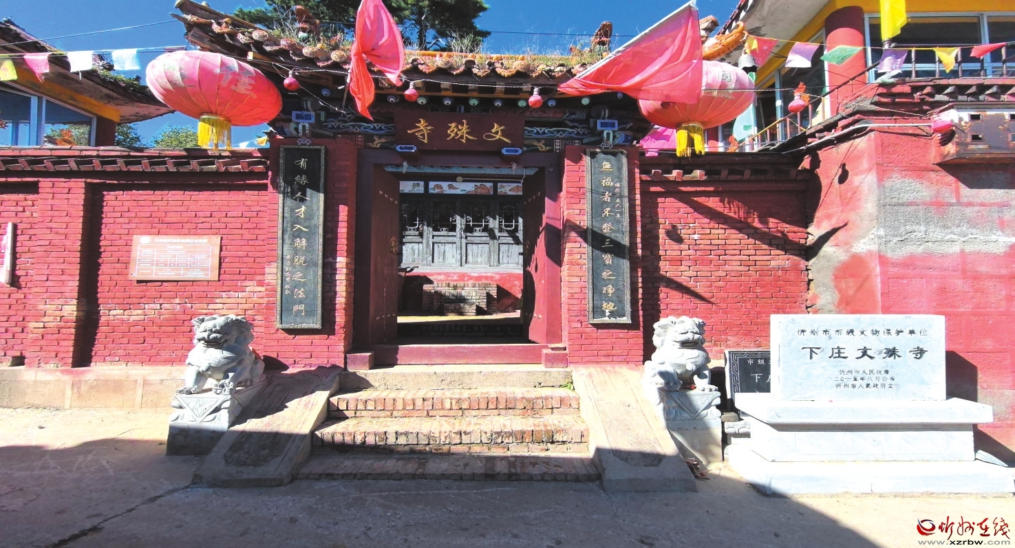 下莊文殊寺位于五臺縣東雷鄉(xiāng)下莊村中,始創(chuàng)年代不詳,現(xiàn)存建筑為明代所建。寺廟坐北向南,占地面積368平方米。山門一間,中置板門。正殿面寬三間、進深五椽,前出廊(此走廊屬清代遺構(gòu),為后期加接),廊柱施斗拱,大斗口內(nèi)出跳,兩側(cè)帶有雕花翼拱。檐柱頭斗拱為五踩,其下昂已被鋸掉(現(xiàn)存昂嘴為清代更換的如意昂式);平身科斗拱亦為五踩。當心間設(shè)門,兩次間設(shè)直欞窗。