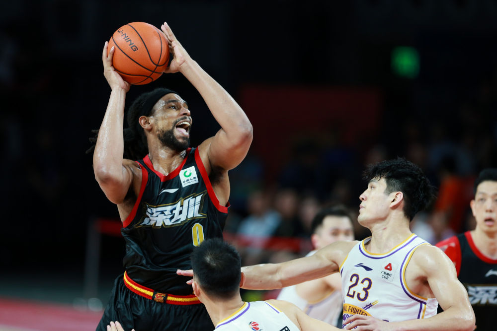4月15日,深圳隊球員薩林杰(左)在比賽中伺機進攻。新華社發(fā)(彭志剛攝)
