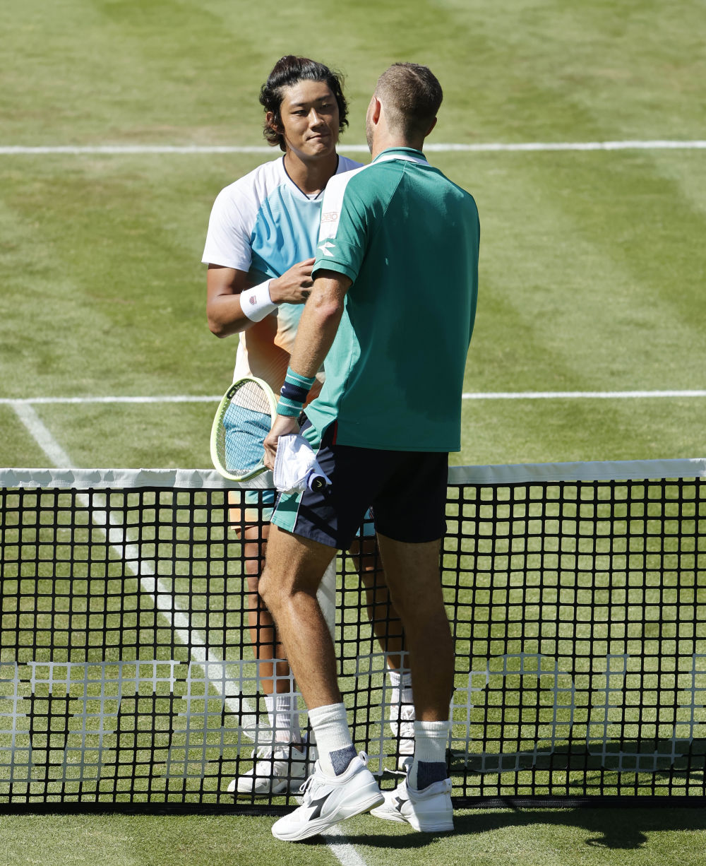 2023年6月13日,張之臻(左)在比賽后與斯特魯夫致意。當(dāng)日,在德國斯圖加特網(wǎng)球公開賽男子單打首輪比賽中,中國選手張之臻以0比2不敵德國選手斯特魯夫,無緣第二輪。新華社發(fā)(菲利普·魯伊茲 攝)