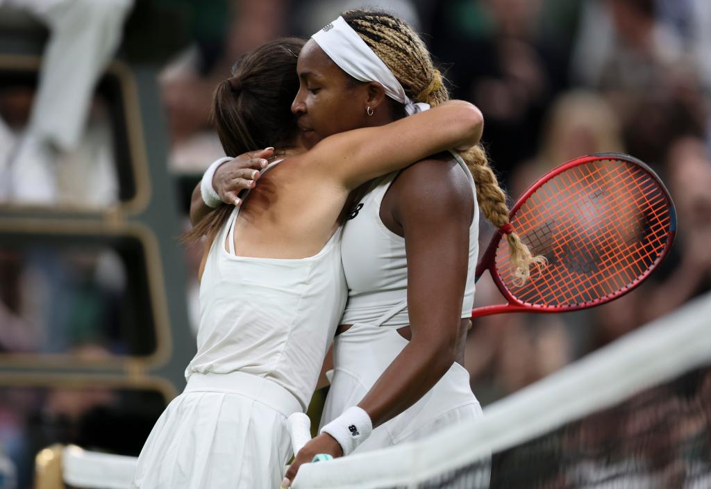 7月7日,高芙(右)與納瓦羅在比賽后擁抱致意。新華社記者 韓巖 攝