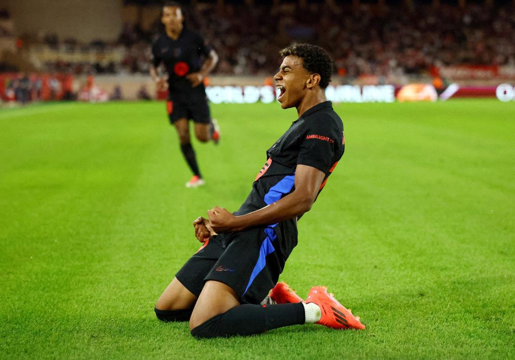 9月19日,巴塞羅那隊球員亞馬爾(前)在比賽中進球后慶祝。新華社/路透