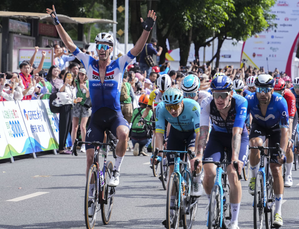 10月16日,速的奧快步車隊(duì)的比利時(shí)車手瓦爾·范格魯威(左一)在沖線后慶祝。新華社記者 金皓原 攝