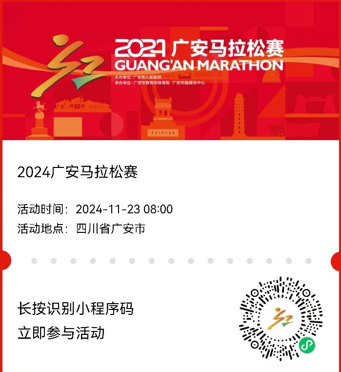 2024廣安馬拉松由中國(guó)田徑協(xié)會(huì)認(rèn)證,廣安市人民政府主辦。賽事以“共富思源 奔跑廣安”為主題,規(guī)模20000人,共設(shè)置馬拉松(42.195公里)、半程馬拉松(21.0975公里)及歡樂(lè)跑(5公里)三個(gè)競(jìng)賽項(xiàng)目。其中,馬拉松項(xiàng)目限報(bào)3000人,半程馬拉松項(xiàng)目限報(bào)7000人,歡樂(lè)跑項(xiàng)目限報(bào)10000人,各項(xiàng)目均報(bào)滿即止。本屆賽事除公開(kāi)線上報(bào)名外,還將邀請(qǐng)全國(guó)媒體跑團(tuán)、企業(yè)家跑團(tuán)、知名人士跑團(tuán)、川渝高校跑團(tuán)、社會(huì)跑團(tuán)等組成跑團(tuán)方陣,為成渝地區(qū)雙城經(jīng)濟(jì)圈建設(shè)助陣。