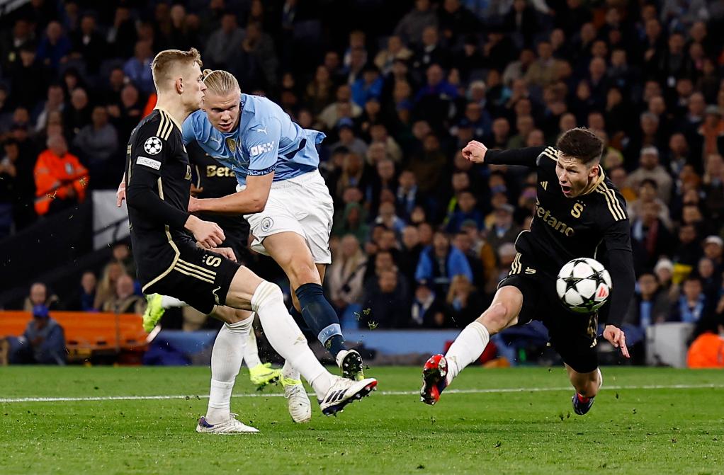 10月23日,曼城隊球員哈蘭德(中)在比賽中射門得分。新華社發(fā)